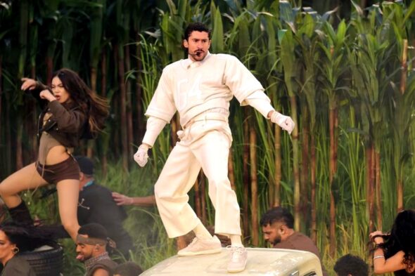 The performance opened with hits “Titi Me Pregunto” and “Yo Perreo Sola”, featuring a sugar cane plantation, a traditional piragua cart, and a staged wedding, all set against his signature “La Casita” backdrop — a recreation of a Puerto Rican home. Celebrity guests including Pedro Pascal, Jessica Alba, and Cardi B joined the festivities, adding star power to the colorful spectacle.