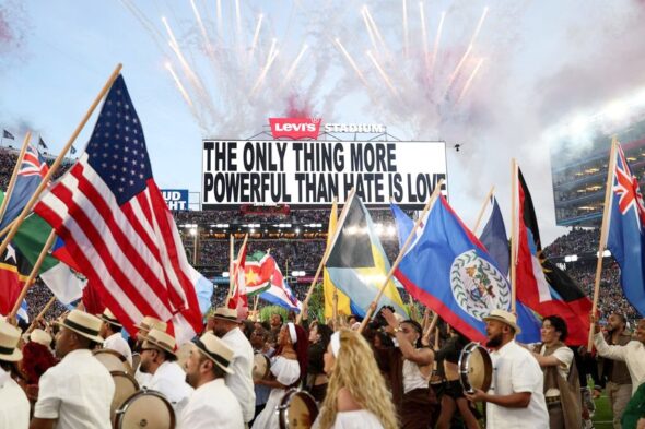 The show ended on a note of unity. After naming Latin American countries alongside the United States and Canada, Bad Bunny spiked a football reading “Together, we are America,” while a stadium screen declared: “The only thing more powerful than hate is love.”