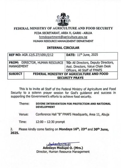A leaked internal circular dated 11 June 2025, signed by Director of Human Resource Management, Mrs Adedayo Modupe O., had instructed all staff including directors, deputy directors, assistant directors, and value chain desk officers to attend prayer sessions on three consecutive Mondays: June 16, 23, and 30. Themed “Divine Intervention for Protection and National Development,” the memo also instructed participants to fast while gathering at the Ministry’s headquarters in Abuja.