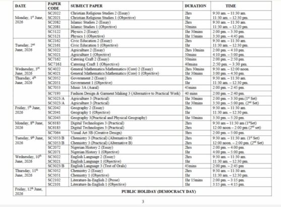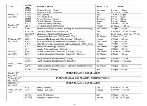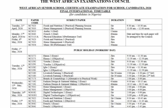 Candidates are advised to consult the full timetable on WAEC’s official communication channels for specific subject dates and times. The council has also reminded schools to adhere strictly to the published schedule, as any deviations may attract penalties under the examination regulations.